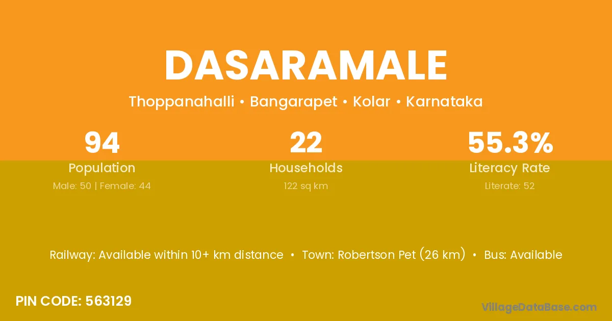 Dasaramale village has a total population of 94 people, of which 50 are males and 44 are females.