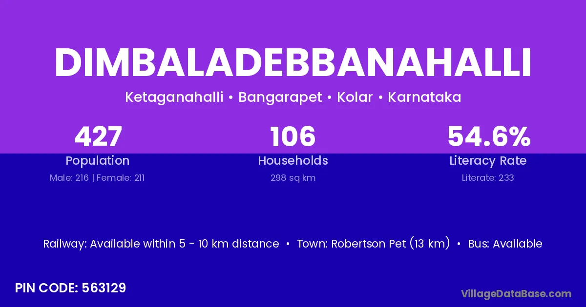 Robertson Pet (13 km) is the nearest town to Dimbaladebbanahalli village for major economic activities and is located approximately 13 km away.