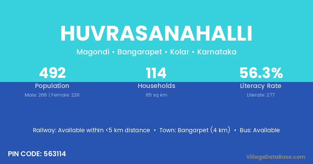 Bangarpet (4 km) is the nearest town to Huvrasanahalli village for major economic activities and is located approximately 4 km away.