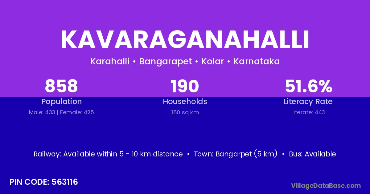 Kavaraganahalli village has a total population of 858 people, of which 433 are males and 425 are females.