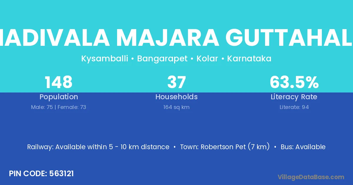 Robertson Pet (7 km) is the nearest town to Madivala Majara Guttahalli village for major economic activities and is located approximately 7 km away.