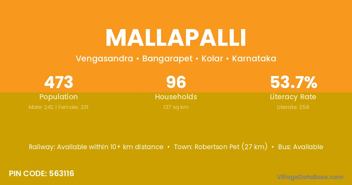 Robertson Pet (27 km) is the nearest town to Mallapalli village for major economic activities and is located approximately 27 km away.