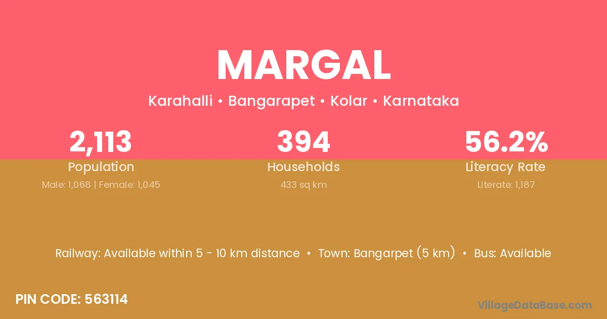 Bangarpet (5 km) is the nearest town to Margal village for major economic activities and is located approximately 5 km away.