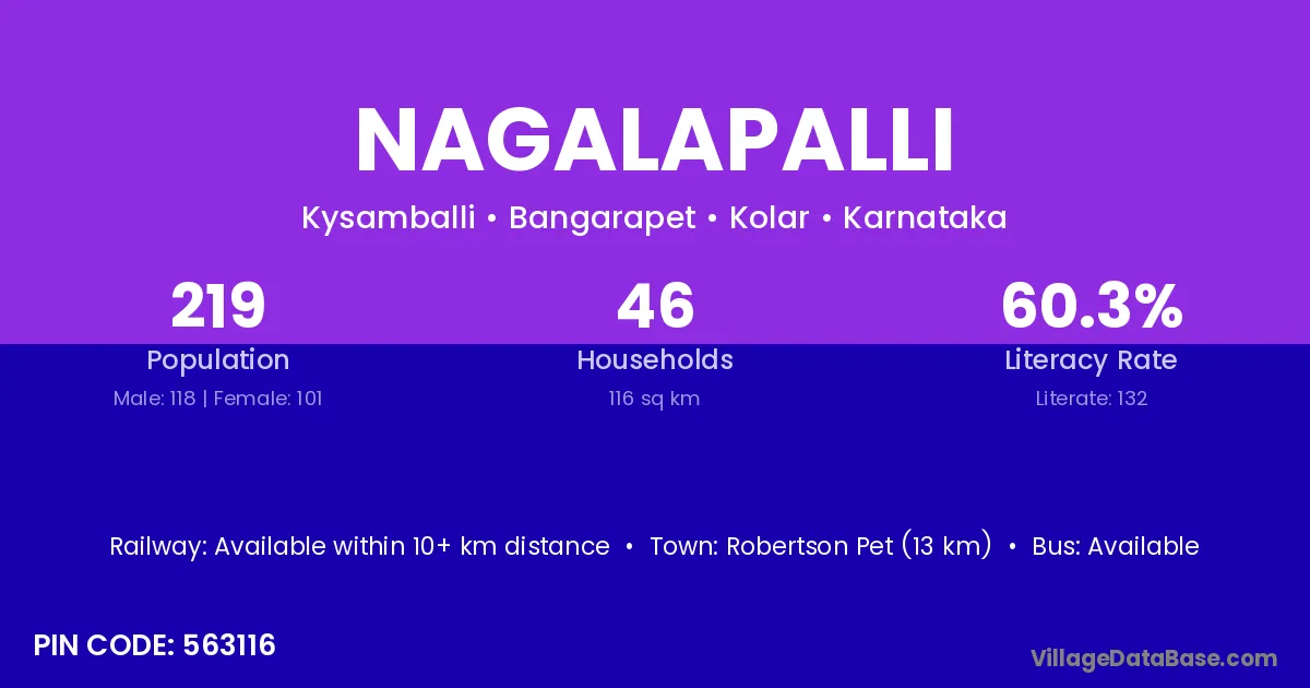 Robertson Pet (13 km) is the nearest town to Nagalapalli village for major economic activities and is located approximately 13 km away.
