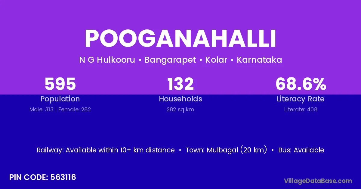 Mulbagal (20 km) is the nearest town to Pooganahalli village for major economic activities and is located approximately 20 km away.