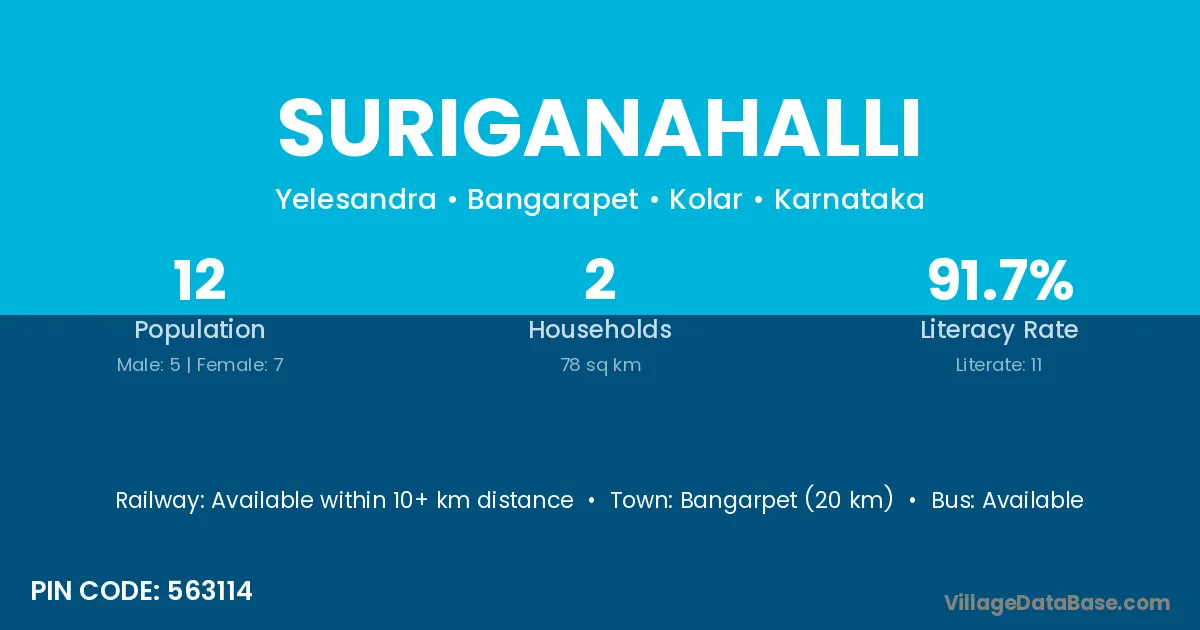 Bangarpet (20 km) is the nearest town to Suriganahalli village for major economic activities and is located approximately 20 km away.