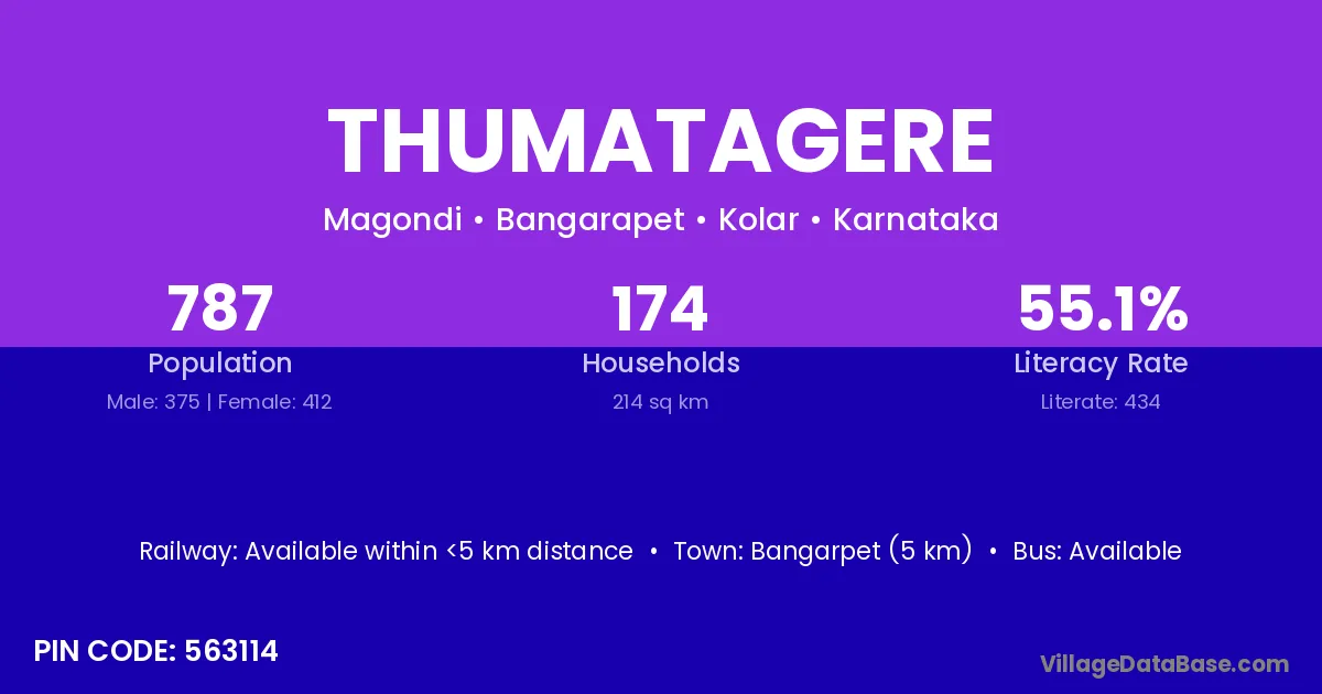 Bangarpet (5 km) is the nearest town to Thumatagere village for major economic activities and is located approximately 5 km away.