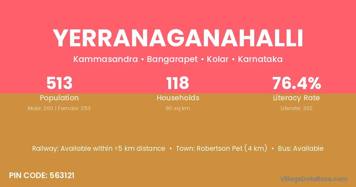 Robertson Pet (4 km) is the nearest town to Yerranaganahalli village for major economic activities and is located approximately 4 km away.