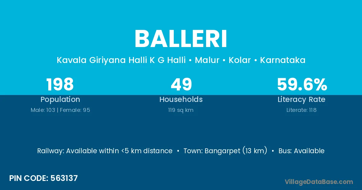 Bangarpet (13 km) is the nearest town to Balleri village for major economic activities and is located approximately 13 km away.