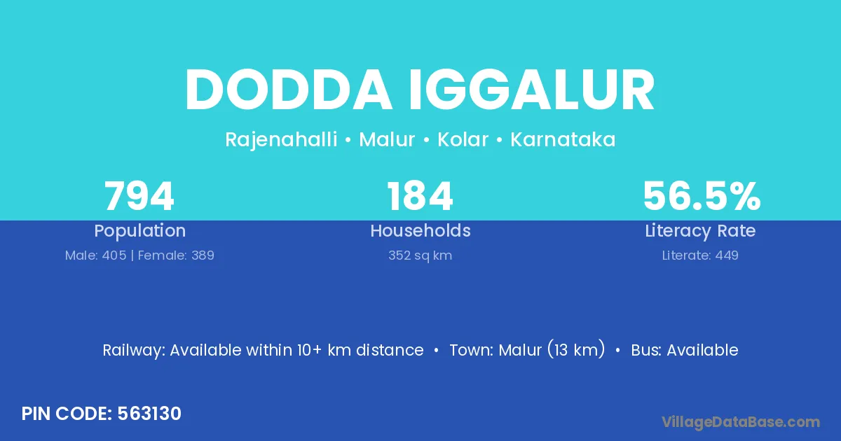 Malur (13 km) is the nearest town to Dodda Iggalur village for major economic activities and is located approximately 13 km away.