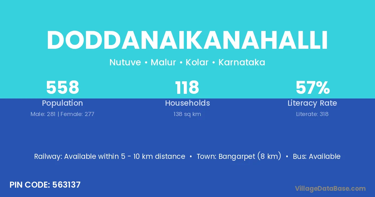 Doddanaikanahalli village has a total population of 558 people, of which 281 are males and 277 are females.