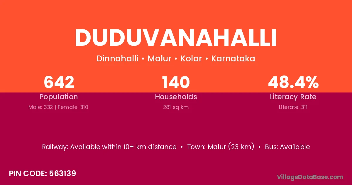Malur (23 km) is the nearest town to Duduvanahalli village for major economic activities and is located approximately 23 km away.