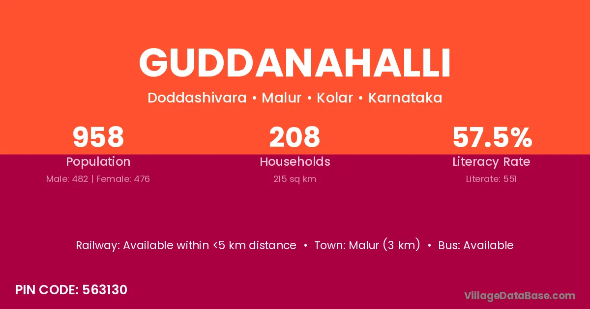 Malur (3 km) is the nearest town to Guddanahalli village for major economic activities and is located approximately 3 km away.