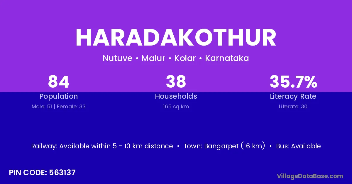 Bangarpet (16 km) is the nearest town to Haradakothur village for major economic activities and is located approximately 16 km away.