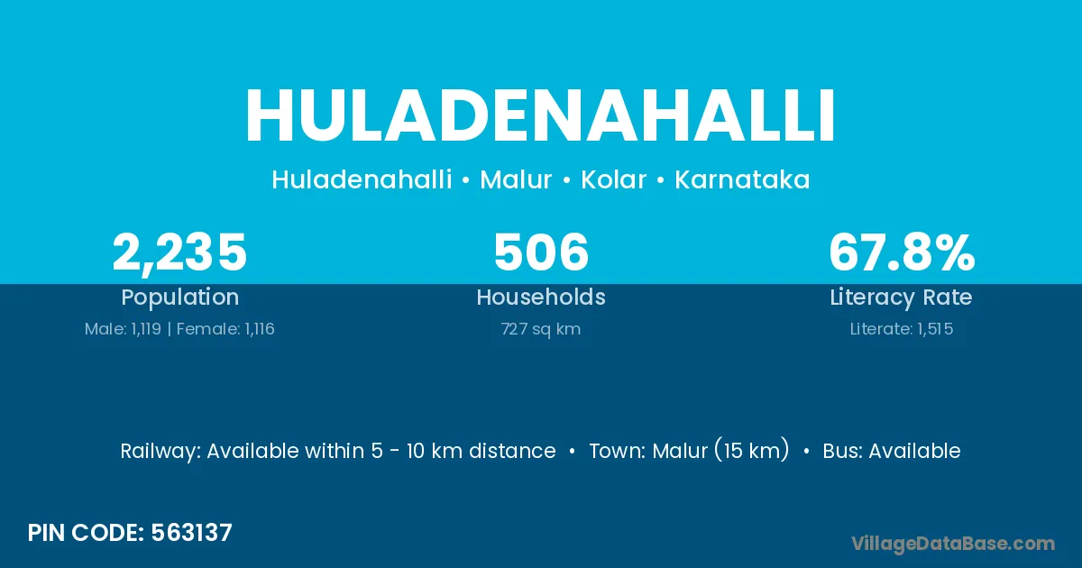 Malur (15 km) is the nearest town to Huladenahalli village for major economic activities and is located approximately 15 km away.