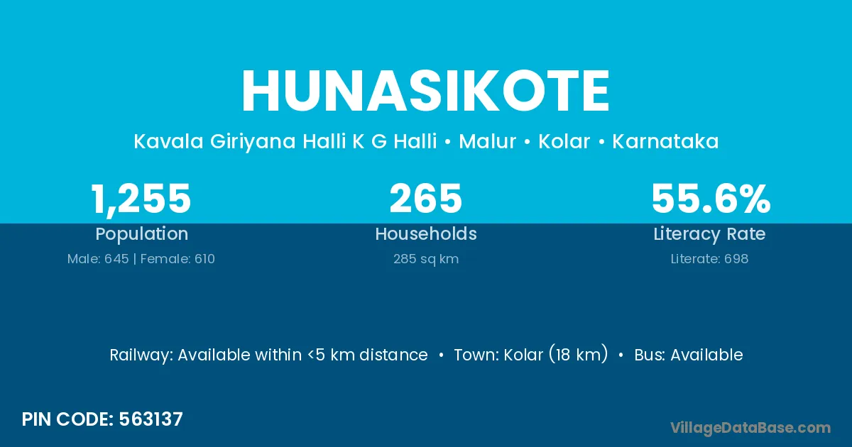 Kolar (18 km) is the nearest town to Hunasikote village for major economic activities and is located approximately 18 km away.