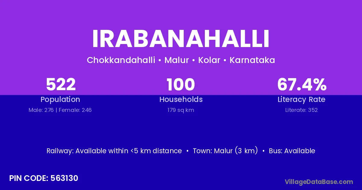 Malur (3 km) is the nearest town to Irabanahalli village for major economic activities and is located approximately 3 km away.