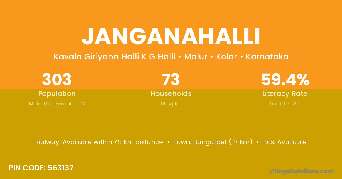 Bangarpet (12 km) is the nearest town to Janganahalli village for major economic activities and is located approximately 12 km away.