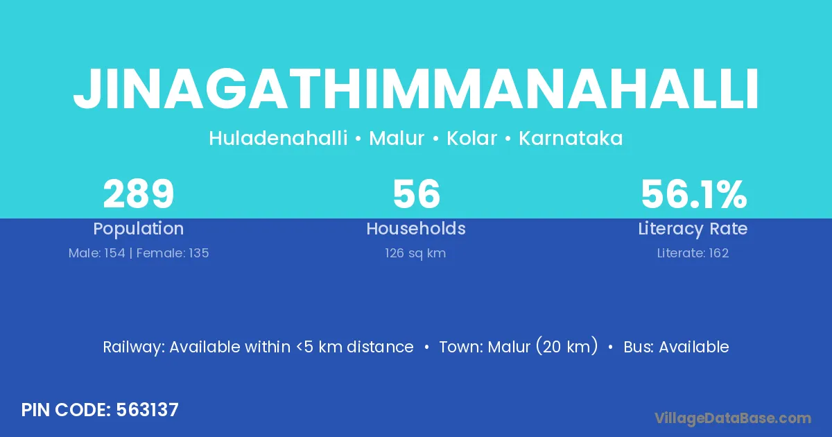 Jinagathimmanahalli village has a total population of 289 people, of which 154 are males and 135 are females.