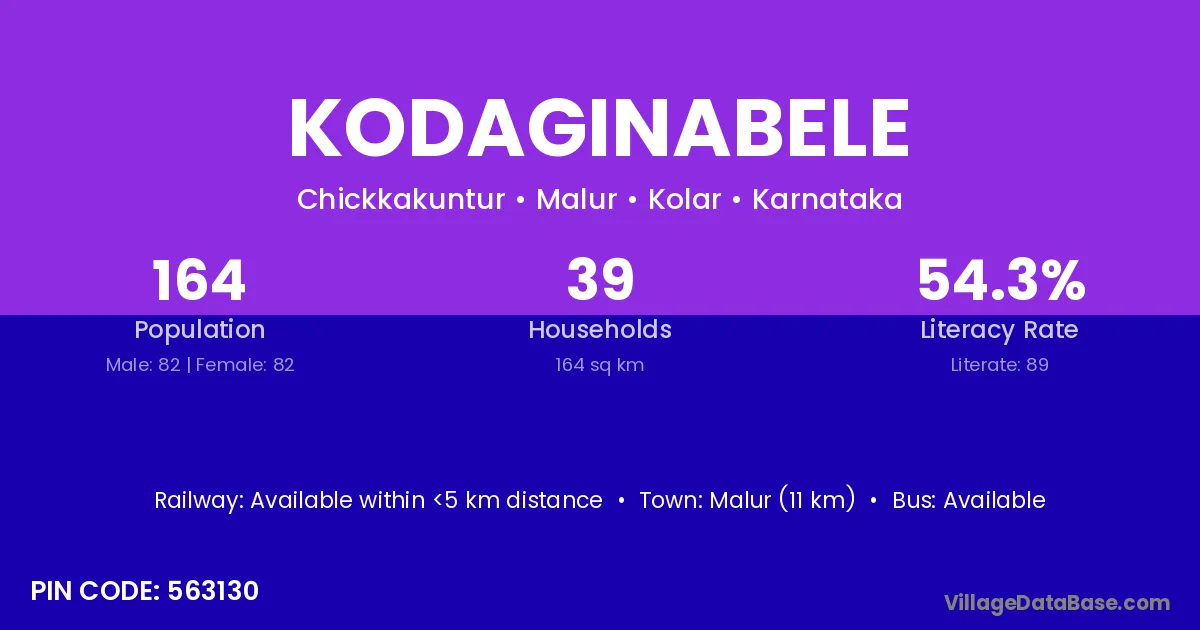Malur (11 km) is the nearest town to Kodaginabele village for major economic activities and is located approximately 11 km away.
