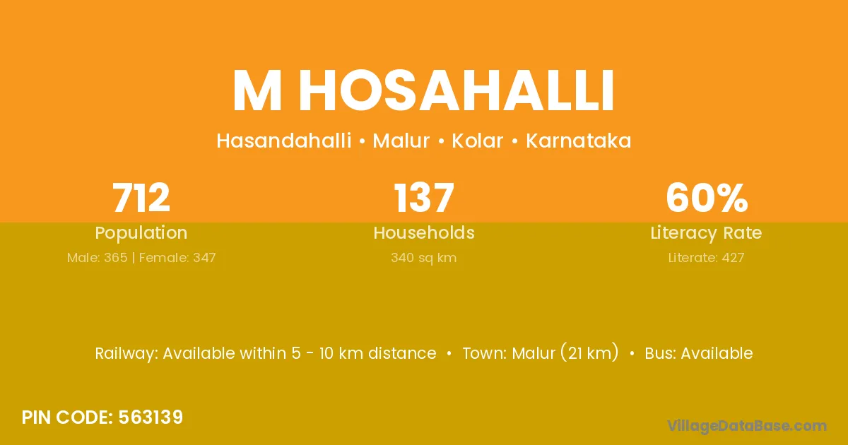 Malur (21 km) is the nearest town to M Hosahalli village for major economic activities and is located approximately 21 km away.