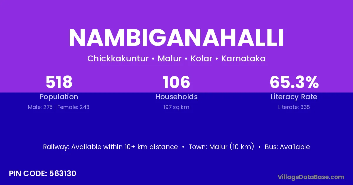 Malur (10 km) is the nearest town to Nambiganahalli village for major economic activities and is located approximately 10 km away.