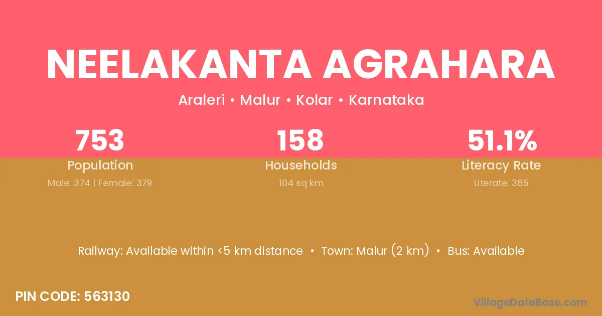 Malur (2 km) is the nearest town to Neelakanta Agrahara village for major economic activities and is located approximately 2 km away.