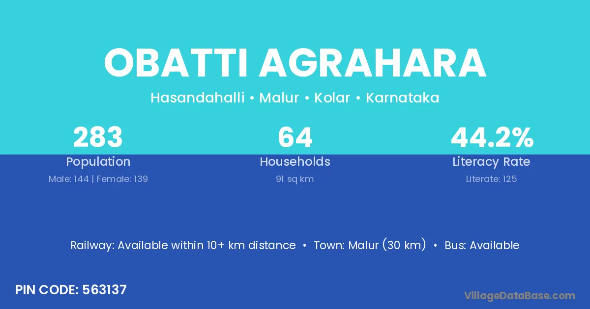 Malur (30 km) is the nearest town to Obatti Agrahara village for major economic activities and is located approximately 30 km away.