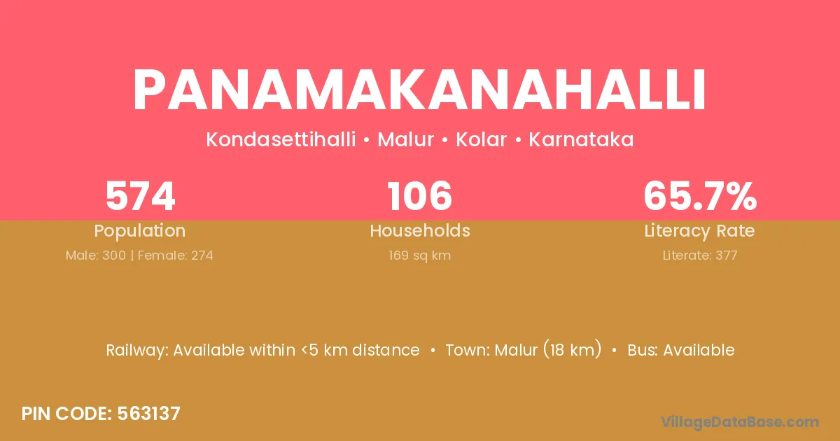 Malur (18 km) is the nearest town to Panamakanahalli village for major economic activities and is located approximately 18 km away.