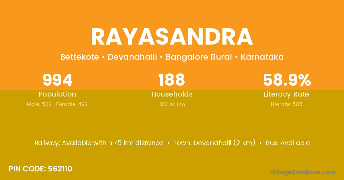 Malur (29 km) is the nearest town to Rayasandra village for major economic activities and is located approximately 29 km away.