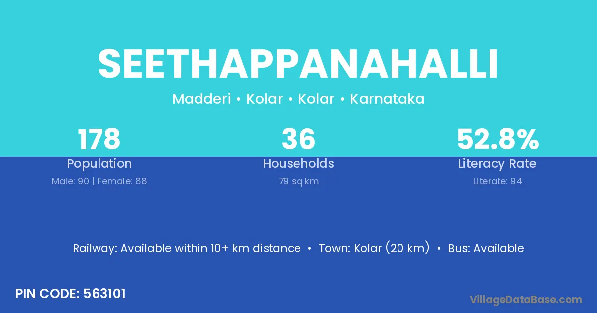 Malur (11 km) is the nearest town to Seethappanahalli village for major economic activities and is located approximately 11 km away.