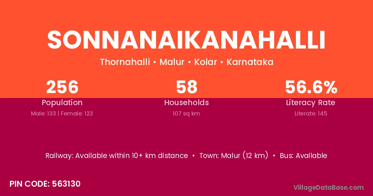 Malur (12 km) is the nearest town to Sonnanaikanahalli village for major economic activities and is located approximately 12 km away.