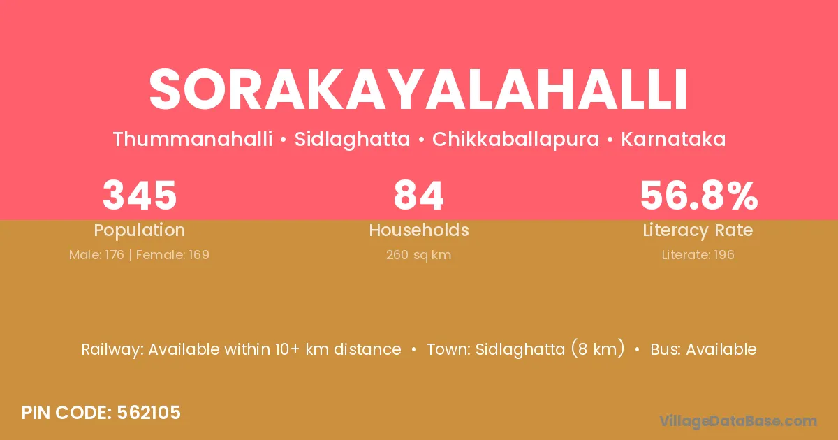The literacy rate of Sorakayalahalli village is 48.36%. Male literacy stands at 50.43% and female literacy at 45.92%.