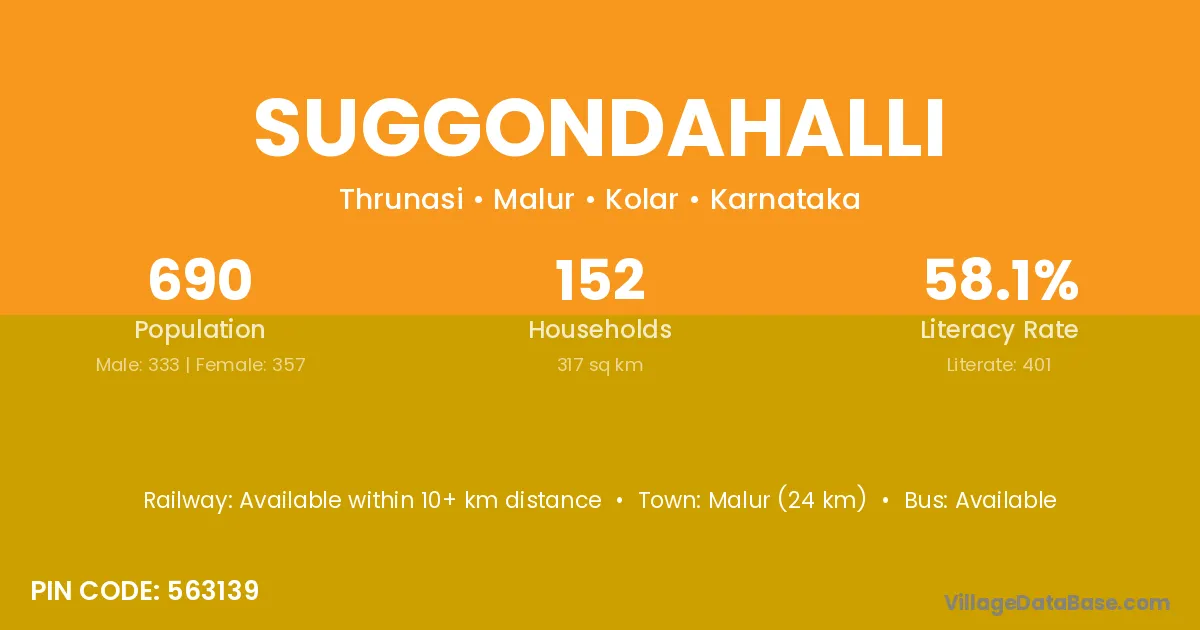 Malur (24 km) is the nearest town to Suggondahalli village for major economic activities and is located approximately 24 km away.