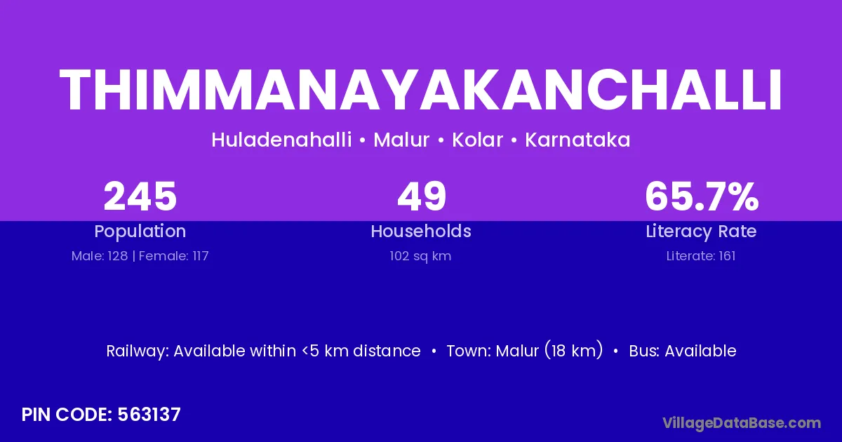 Thimmanayakanchalli village has a total population of 245 people, of which 128 are males and 117 are females.
