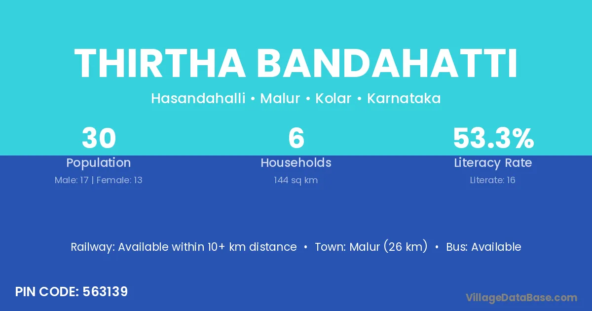 Thirtha Bandahatti village has a total population of 30 people, of which 17 are males and 13 are females.