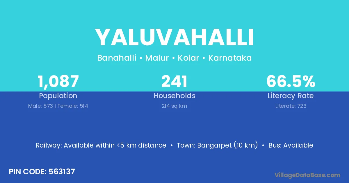 Bangarpet (10 km) is the nearest town to Yaluvahalli village for major economic activities and is located approximately 10 km away.