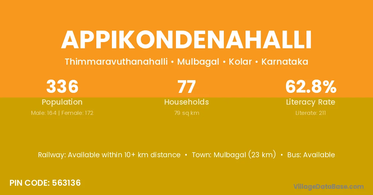 Mulbagal (23 km) is the nearest town to Appikondenahalli village for major economic activities and is located approximately 23 km away.