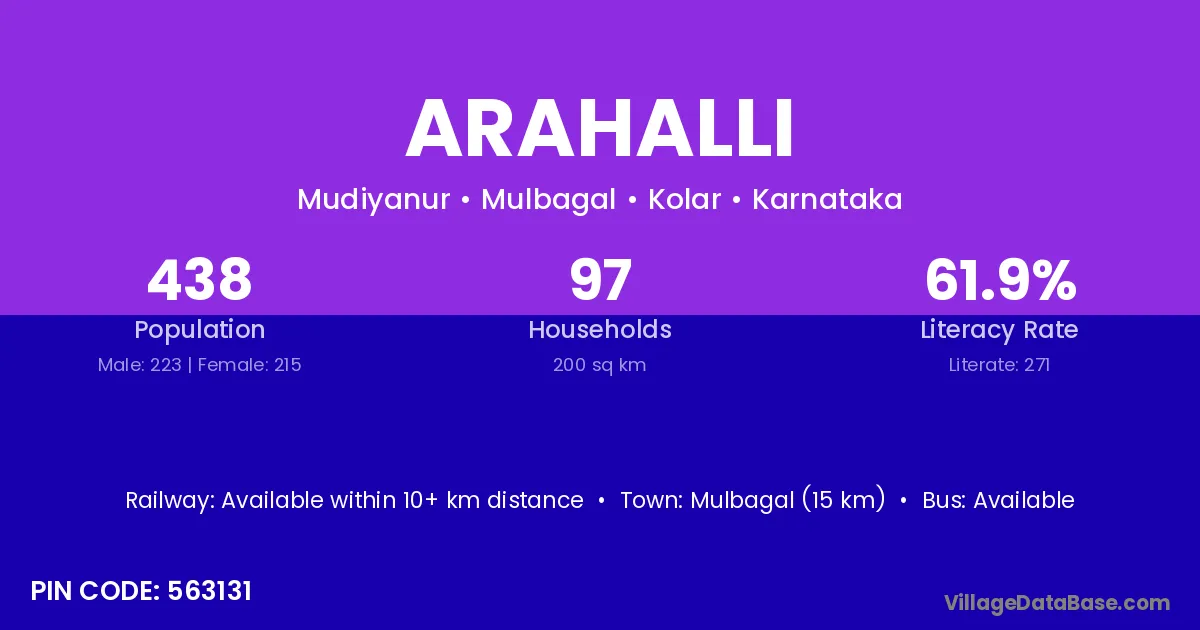 Mulbagal (15 km) is the nearest town to Arahalli village for major economic activities and is located approximately 15 km away.