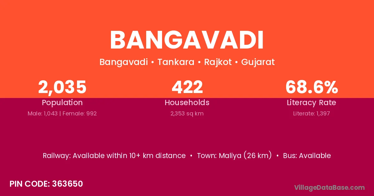 The literacy rate of Bangavadi village is 65.74%. Male literacy stands at 79.90% and female literacy at 52.00%.