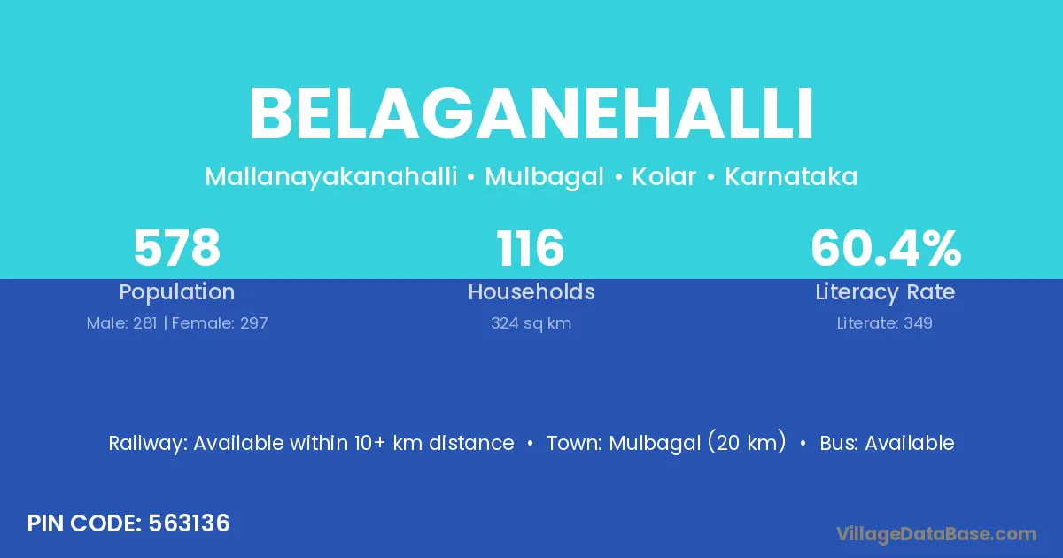 Mulbagal (20 km) is the nearest town to Belaganehalli village for major economic activities and is located approximately 20 km away.