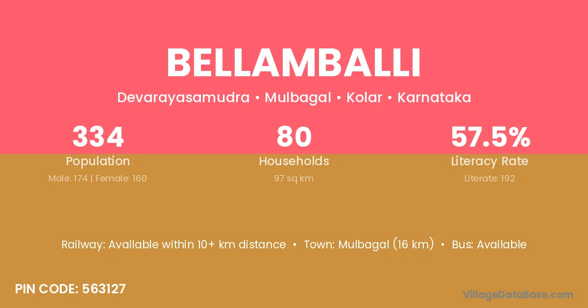 Mulbagal (16 km) is the nearest town to Bellamballi village for major economic activities and is located approximately 16 km away.