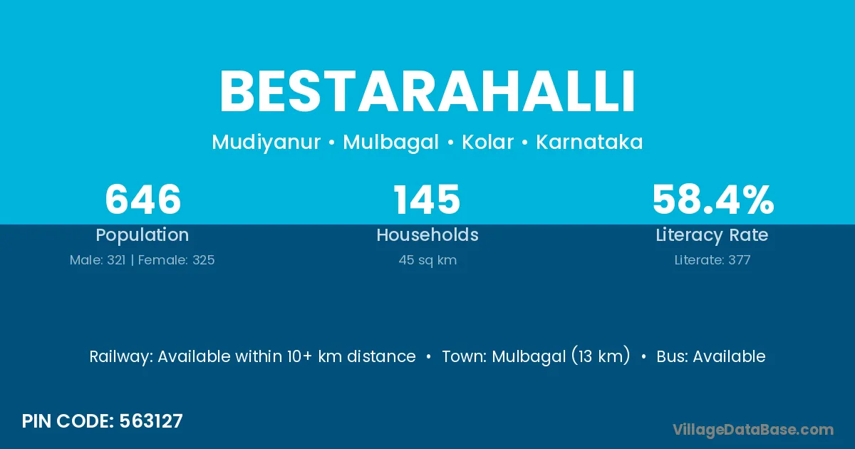 Bestarahalli village has a total population of 646 people, of which 321 are males and 325 are females.