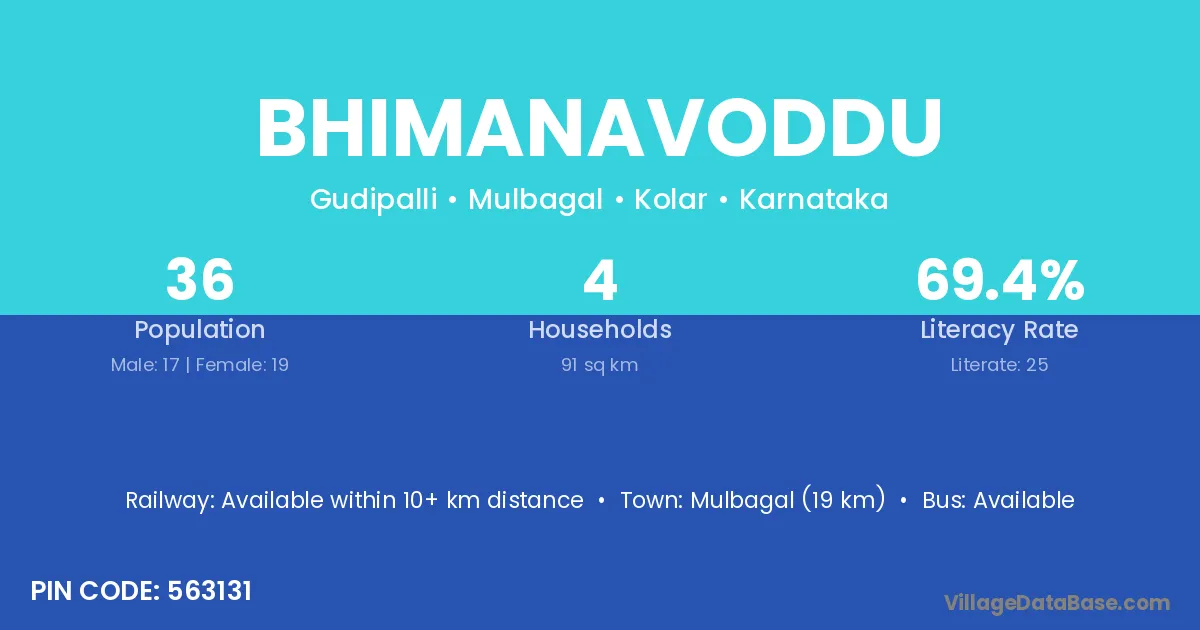 Mulbagal (19 km) is the nearest town to Bhimanavoddu village for major economic activities and is located approximately 19 km away.