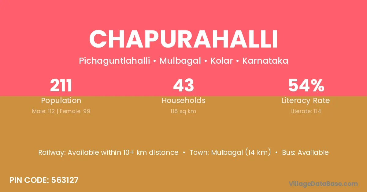 Chapurahalli village has a total population of 211 people, of which 112 are males and 99 are females.