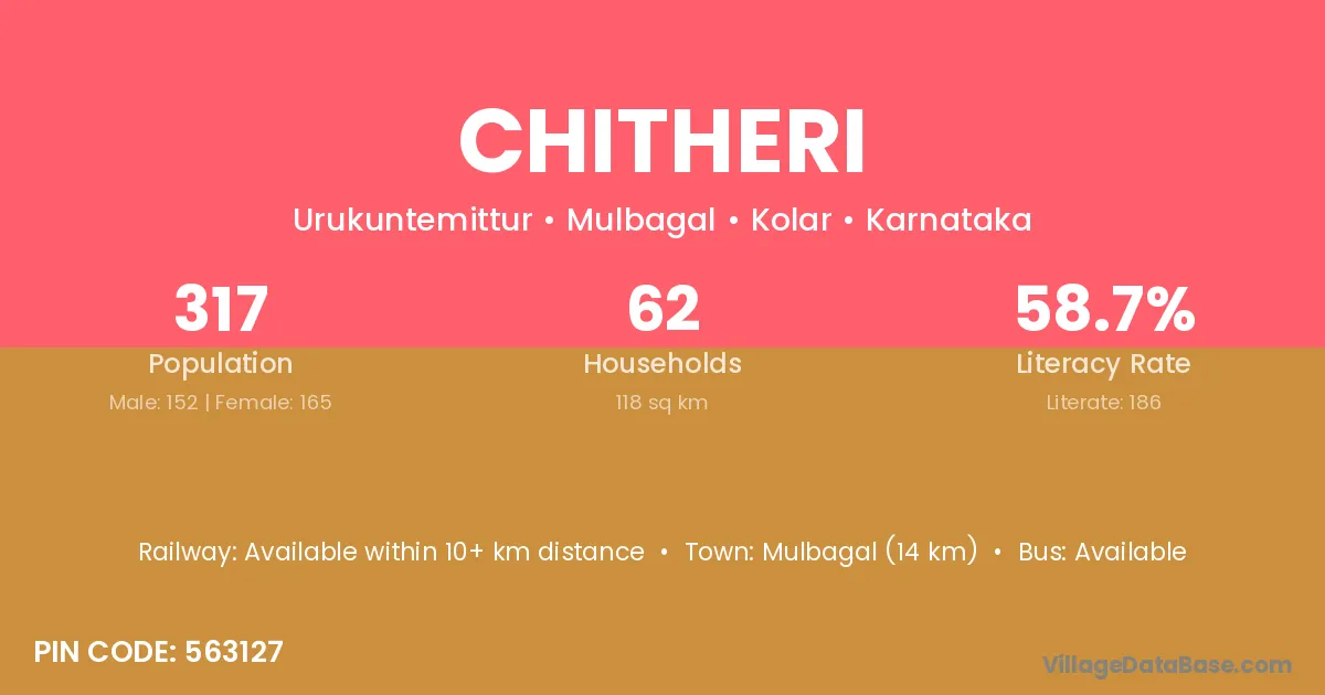 Mulbagal (14 km) is the nearest town to Chitheri village for major economic activities and is located approximately 14 km away.