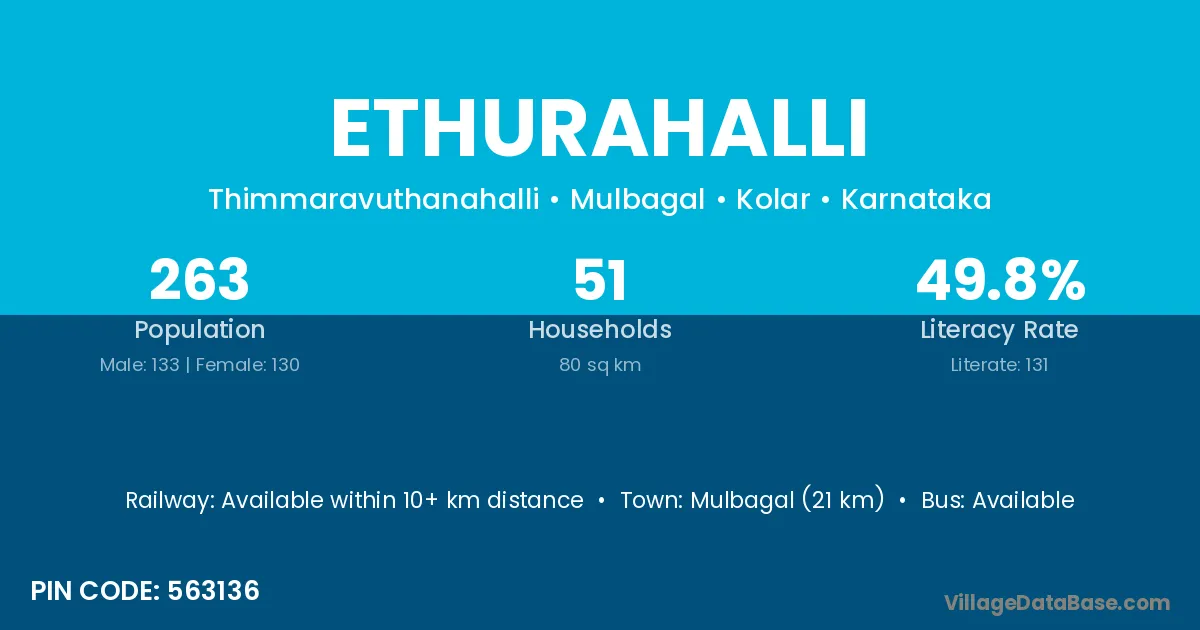 Ethurahalli village has a total population of 263 people, of which 133 are males and 130 are females.