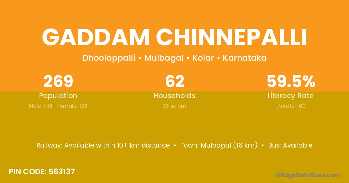 Mulbagal (16 km) is the nearest town to Gaddam Chinnepalli village for major economic activities and is located approximately 16 km away.