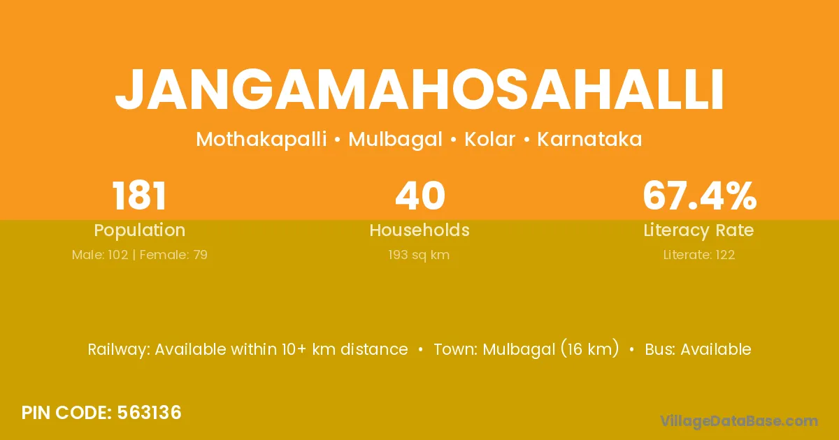 Mulbagal (16 km) is the nearest town to Jangamahosahalli village for major economic activities and is located approximately 16 km away.