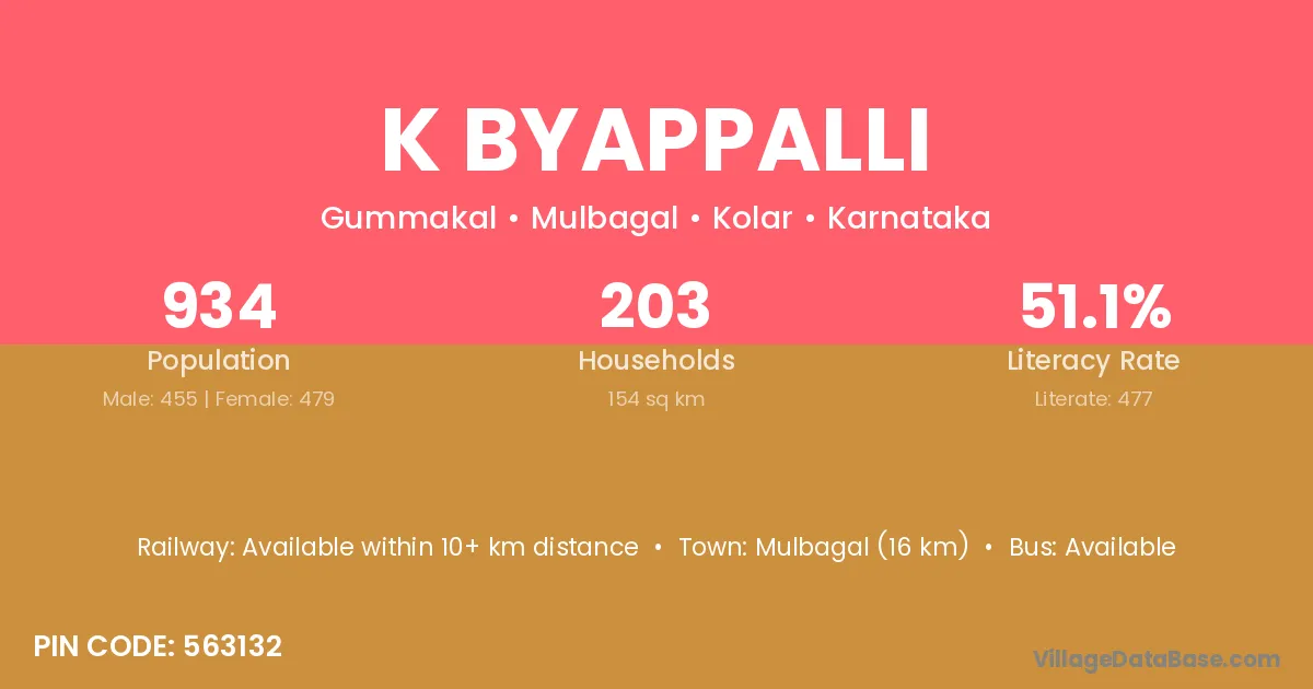 Mulbagal (16 km) is the nearest town to K Byappalli village for major economic activities and is located approximately 16 km away.